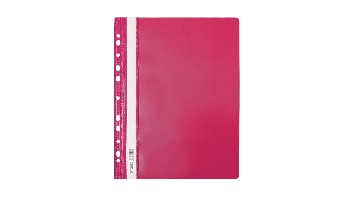 - folia PVC. przód twardy przezroczysty. tył twardy kolorowy_- boczna perforacja umożliwia wpięcie do segregatora z dowolnym ringiem_- w środku blaszka i wąs o długości 16.5 cm. umożliwiający wpięcie dokumentów do 2 cm_- wymienny papierowy pasek do opisu z kodem kreskowym na szt._- dwa wycięcia ułatwiające wysuwanie paska_- zaokrąglone rogi obu okładek