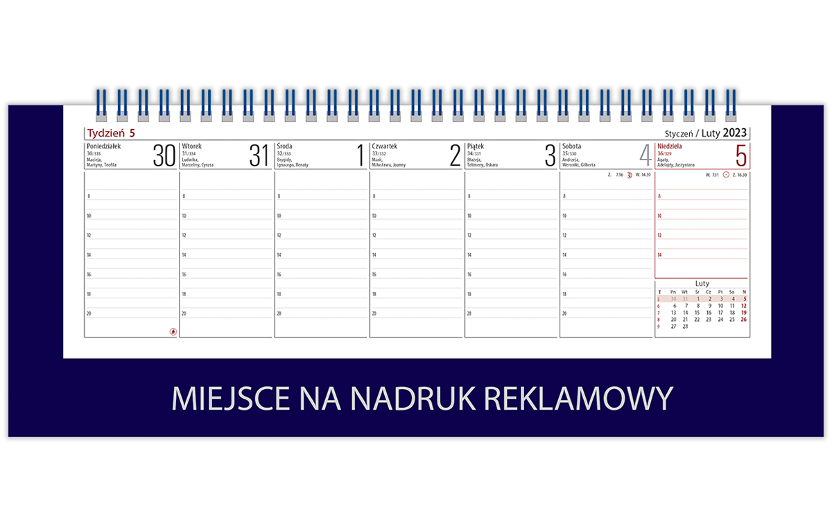 Podłużny kalendarz biurowy stojący. Podział godzinowy dnia pracy pozwala na dokładne planowanie dnia. Kalendarium skrócone aktualnego miesiąca na każdej stronie. Podstawka ze sztywnego kartonu zadrukowana w kolorze granatowym (H4-G), kremowym (H4-K) lub białym (H4-B).