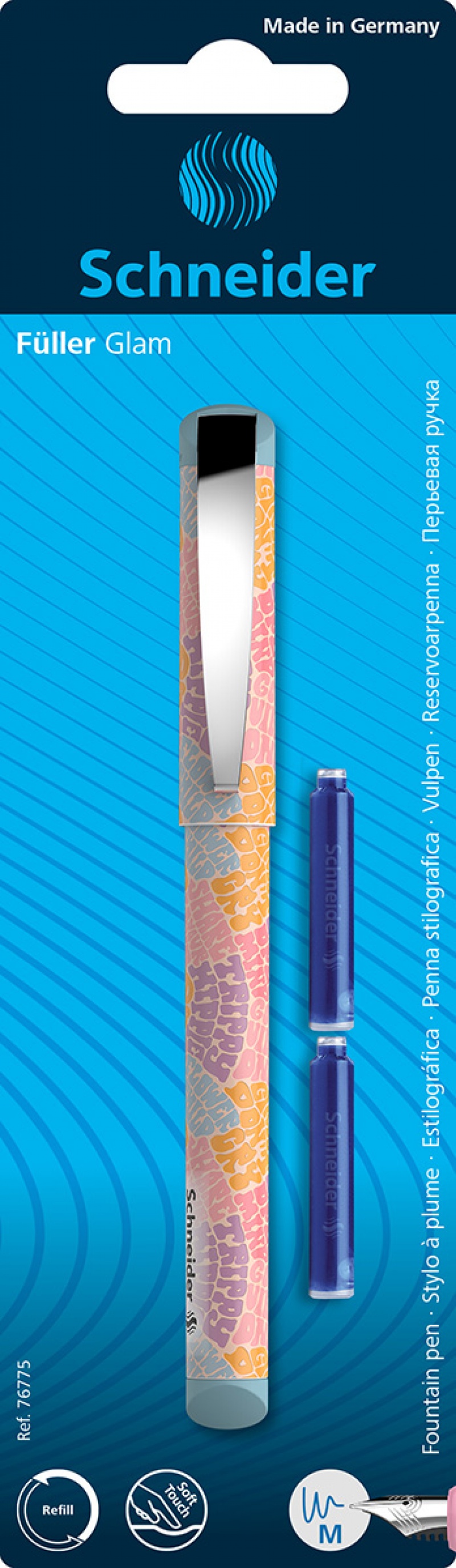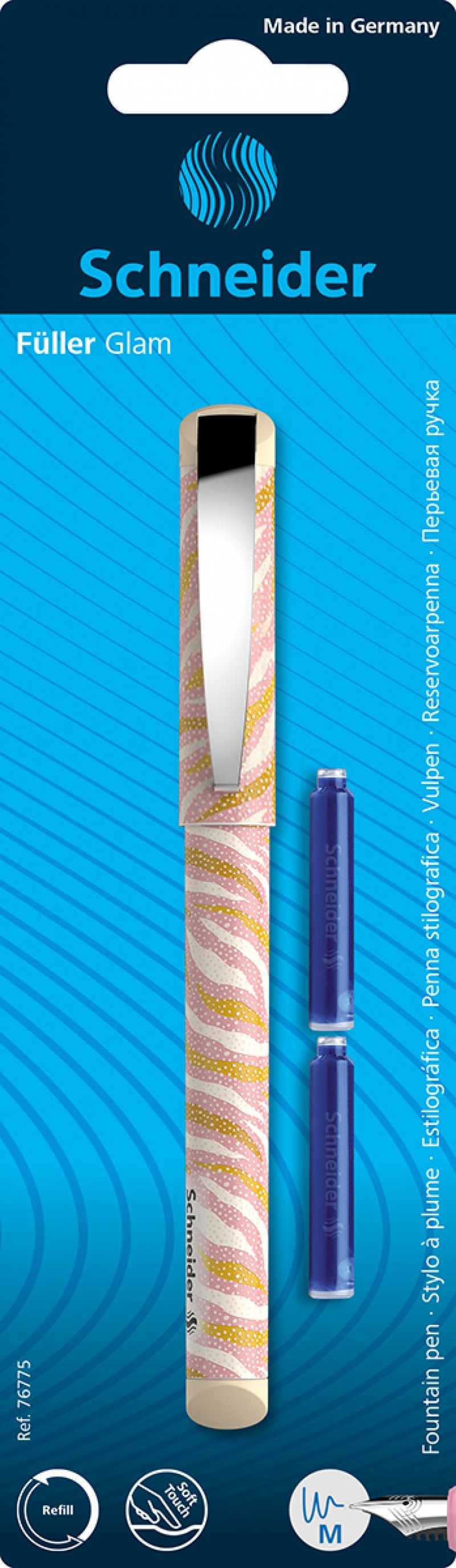 stalówka z wysokiej jakości stali nierdzewnej, z irydową końcówką, stabilny klip metalowy i standardowe naboje z atramentem w kolorze niebieskim - usuwalnym