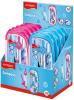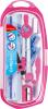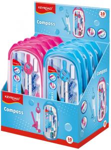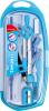 składa się z 9 elementów: cyrkla, gumki do ścierania, temperówki, kątomierza, linijki 15cm, wymiennej końcówki do cyrkla, ekierek 45° i 60° oraz czarnego ołówka