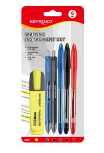 zawiera zakreślacz, 3 klasyczne i 2 żelowe długopisy