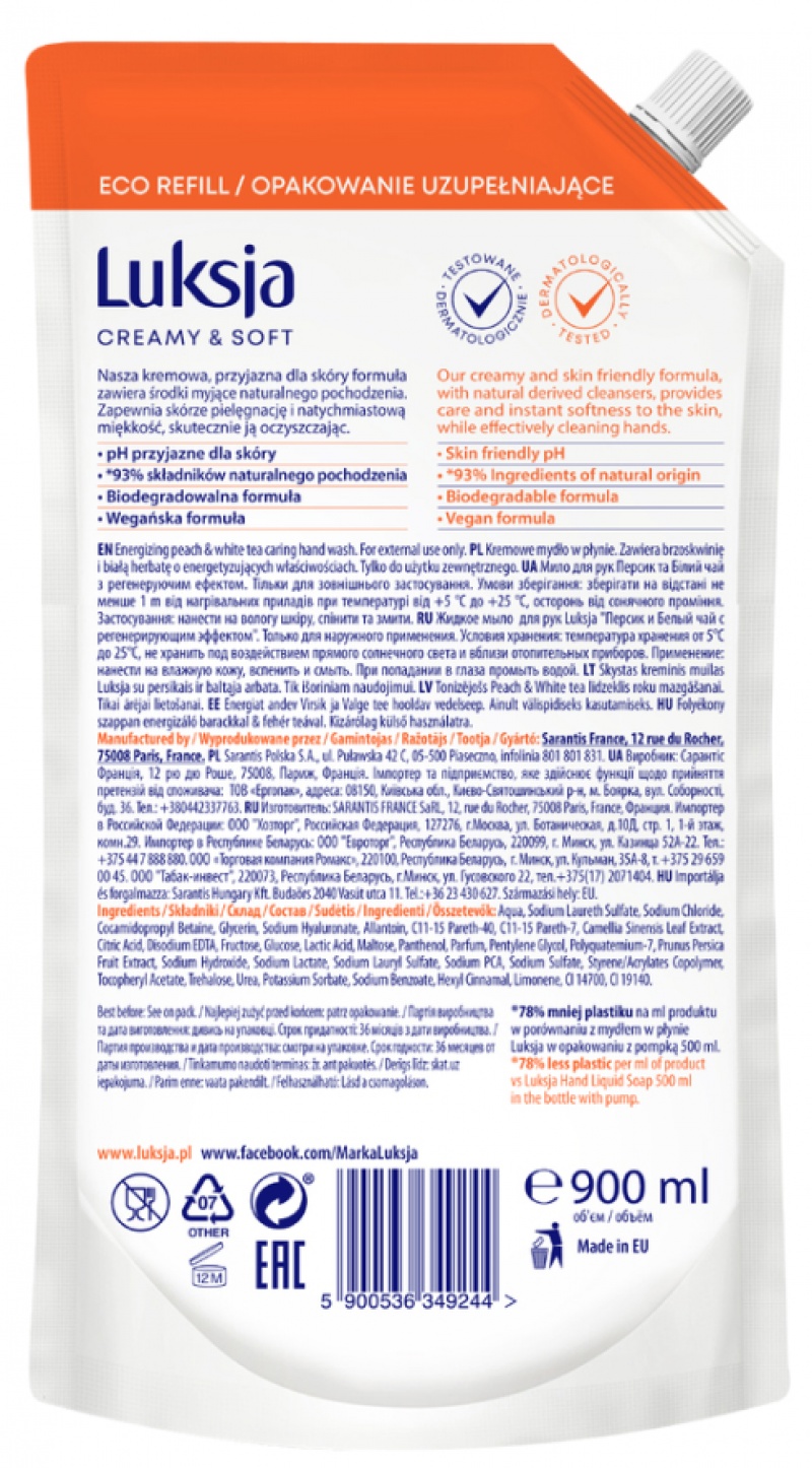 skład: Aqua, Sodium Laureth Sulfate, Sodium Chloride, Cocamidopropyl Betaine, Glycerin, Sodium Hyaluronate, Allantoin, C11-15 Pareth-40, C11-15 Pareth-7, Camellia Sinensis Leaf Extract, Citric Acid, Disodium EDTA, Fructose, Glucose, Lactic Acid, Maltose, Panthenol, Parfum, Pentylene Glycol, Polyquaternium-7, Prunus Persica Fruit Extract, Sodium Hydroxide, Sodium Lactate, Sodium Lauryl Sulfate, Sodium PCA, Sodium Sulfate, Styrene/Acrylates Copolymer, Tocopheryl Acetate, Trehalose, Urea, Potassium Sorbate, Sodium Benzoate, Hexyl Cinnamal, Limonene, CI 14700, CI 19140