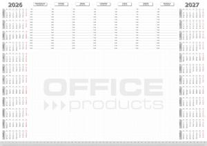 oryginalny projekt zgodny z zasadami organizacji czasu pracy: po lewej stronie kalendarz na 2026 rok, po prawej stronie kalendarz na 2027 rok, na czerwono oznaczone dni wolne, u góry rozkład tygodnia, godziny od 7.00 do 22.00, pod kalendarzem tygodniowym powierzchnia w kratkę przeznaczona na notatki