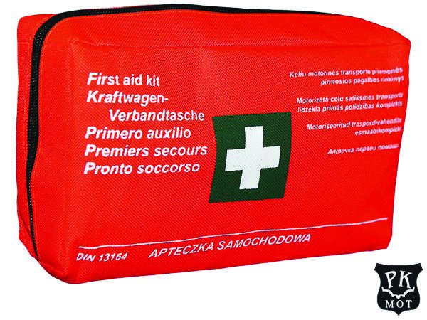 Apteczka pierwszej pomocy. samochodowa. wykonana z tkaniny wodoodpornej wyposażenie zgodne z normą DIN 13164 14-częściowy zestaw plastrów z opatrunkiem: 6×10 cm (4 szt.). 4.3×7.2 cm (2 szt.). 12×2 cm (2 szt.). 1.9×7.2 cm (2 szt.). 2.5×7.2 cm (4 szt.) plaster na szpulce 5 m x 2.5 cm (1 szt.) bandaż elastyczny 4 m x 6 cm (2 szt.) bandaż elastyczny 4 m x 8 cm (3 szt.) rękawiczki winylowe (2 pary) chusteczki nasączone (2 szt.) chusta opatrunkowa 60×80 cm (1 szt.) chusta opatrunkowa 60×40 cm (1 szt.) bandaż z kompresem (opatrunek indywidualny) 6×8 cm (1 szt.) bandaż z kompresem (opatrunek indywidualny) 8×10 cm (2 szt.) bandaż z kompresem (opatrunek indywidualny) 10×12 cm (1 szt.) kompres na rany 10×10 cm (6 szt.) chusta trójkątna 96x96x136 cm (2 szt.) koc termiczny 160×210 cm (1 szt.) nożyczki (1 szt.) instrukcja udzielania pierwszej pomocy wymiary apteczki:24x15x6