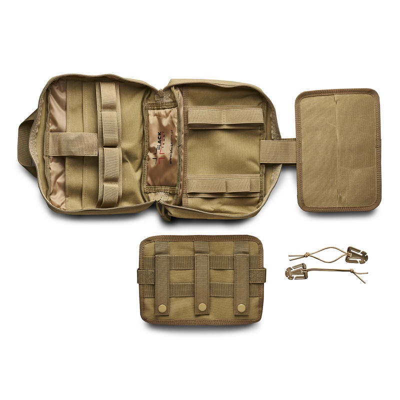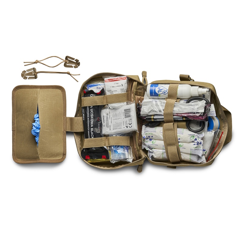 Saszetka Trauma Responder (TR) to futerał zaprojektowany na rozbudowane apteczki pierwszej pomocy, wyposażone w produkty medyczne gotowe do użycia względem większej ilości osób. Mimo niewielkich rozmiarów, produkt jest bardzo kompaktowy i mieści dużą ilość wyposażenia, co sprawia, że stanowi ciekawą alternatywę dla podręcznych toreb opatrunkowych. Konstrukcja zapewnia natychmiastowy i intuicyjny dostęp do całego wyposażenia. W środku można znaleźć wiele kieszeni dedykowanych na opatrunki, liczne gumy z podwójnymi przeszyciami o różnym rozstawie, kieszeń z przeźroczystym oknem na drobne wyroby (np. plastry, paski do zamykania ran itp.) czy też specjalne miejsce dedykowane na rękawiczki. Wszystko to sprawia, że użytkownik ma szerokie możliwości na dowolną konfigurację wyposażenia według własnych preferencji. Tylna część saszetki posiada zrywalny panel z systemem mocowania typu MOLLE, dzięki czemu można ją zamontować w prosty i szybki sposób na innym, przystosowanym do tego ekwipunku. Na przodzie saszetki znajdują się również tzw. laser cuty w systemie MOLLE. Można na nich zamontować najbardziej potrzebne produkty np. nożyczki, opaskę zaciskową itp. za pomocą troków szybkiego montażu, które są na wyposażeniu w ilości 2 sztuk. Produkt posiada gumową plakietkę z krzyżem, który jest międzynarodowym symbolem dla zestawów apteczkowych. Do uszycia saszetki wykorzystuje się komponenty najwyższej jakości. Zastosowany materiał to wysokogatunkowy Nylon o bardzo wysokim splocie 1000D. Charakteryzuje się on odpornością na uszkodzenia i rozdarcia, co gwarantuje wieloletnie i bezproblemowe użytkowanie. Niełamliwe zamki błyskawiczne pochodzą z firmy YKK, a solidne i trwałe klamry dostarcza marka Nexus.