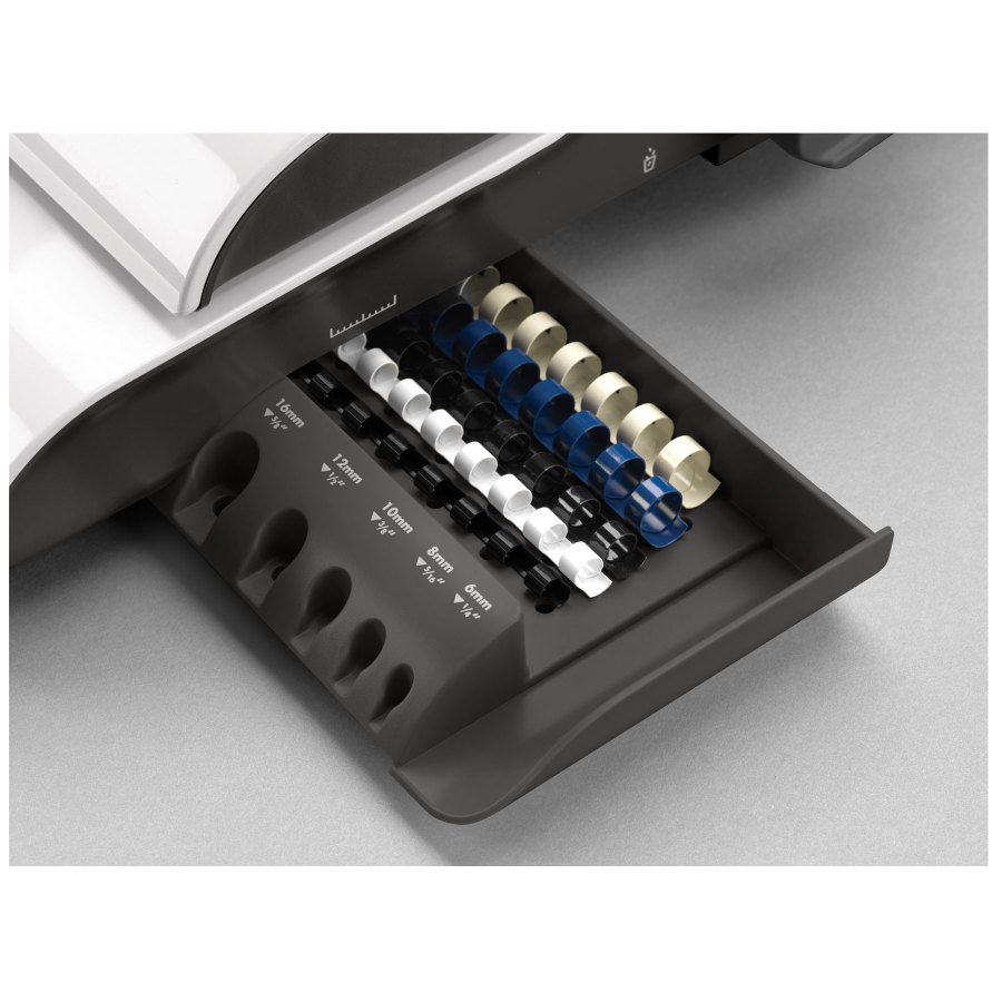 Ergonomiczna. Specjalna. osobna szuflada do przechowywania grzbietów z opatentowanym systemem mierzenia grubości dokumentów i doboru odpowiedniego grzbietu.