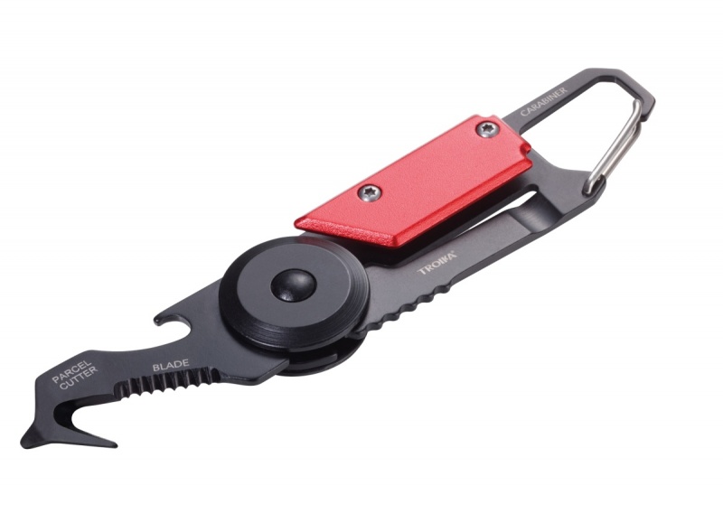 posiada 5 funkcji: nóż do otwierania paczek, karabińczyk, mały brzeszczot, śrubokręt płaski, otwieracz do butelek