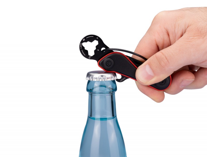 9 praktycznych zastosowań: zwalniacz do wózków sklepowych, nożyk do paczek z ostrzem ze stali nierdzewnej, kółko na klucze (pętla z drutu), otwieracz do butelek, klucz sześciokątny (3 rozmiary), miernik głębokości bieżnika opony (1,6 mm)
