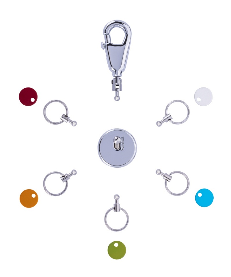 w zestawie z karabińczykiem, 5 wymiennymi kółkami, kolorowymi znacznikami do rozróżniania kluczy