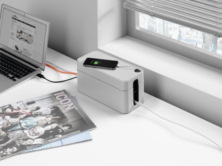 • Niebanalny ogranizer do przechowywania kabli oraz listwy zasilającej 3 gniazda