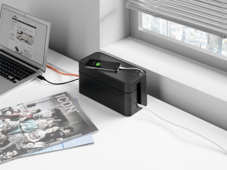 Idealne rozwiązanie na kable i przewody dzięki CAVOLINE_. Gama produktów oferuje koncepcje na uporządkowanie okablowania. a tym samym zapewnia większe bezpieczeństwo w miejscu pracy. Elegancki i nowatorski pojemnik nie tylko zapewnia porządek . ale oferuje wiele innych dodatkowych korzyści. Cała seria CAVOLINE_ sprawdza się nie tylko w biurze. ale również w zaciszu domowym. _ Niebanalny ogranizer do przechowywania kabli oraz listwy zasilającej 3 gniazda _ Dwa otwory na przewody nie tylko są łatwe w obsłudze. ale zapewniają idealną cyrkulację powietrza _ Pokrywa z praktycznym okrągłym otworem na kabel do ładowania telefonu komórkowego _ Z wysokiej jakości trudnopalnego tworzywa sztucznego _ Antypoślizgowe gumowe stopki _ Wymiary: 246 x 116 x 128 mm (szer. x wys. x gł.)