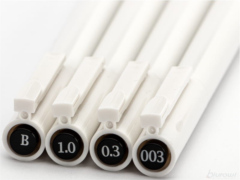Cienkopis Manga z tuszem na bazie wody jest produktem nadającym się idealnie do tworzenia szkiców komiksów projektów graficznych ale również zdobienia pisania i kaligrafii. Cztery grubości końcówek fibrowych i igłowych pozwalają na dobranie grubości idealnie dostosowanej do własnych potrzeb. Cienkopisy Manga o końcówkach igłowych (grubość 0.03 0.3 oraz 1.0 mm) pozwalają na utrzymanie stałej linii a końcówka pędzelkowa pozwala na kontrolowanie grubości linii według własnej fantazji. Tusz jest odporny na rozmazywanie się.