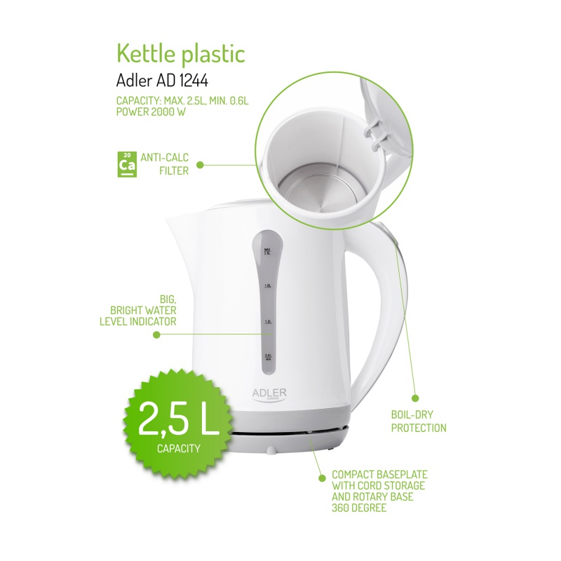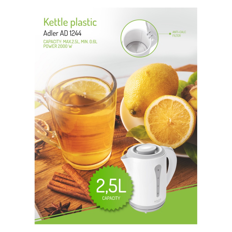 Czajnik elektryczny ADLER AD 1244, 2,5L, tworzywo, biały