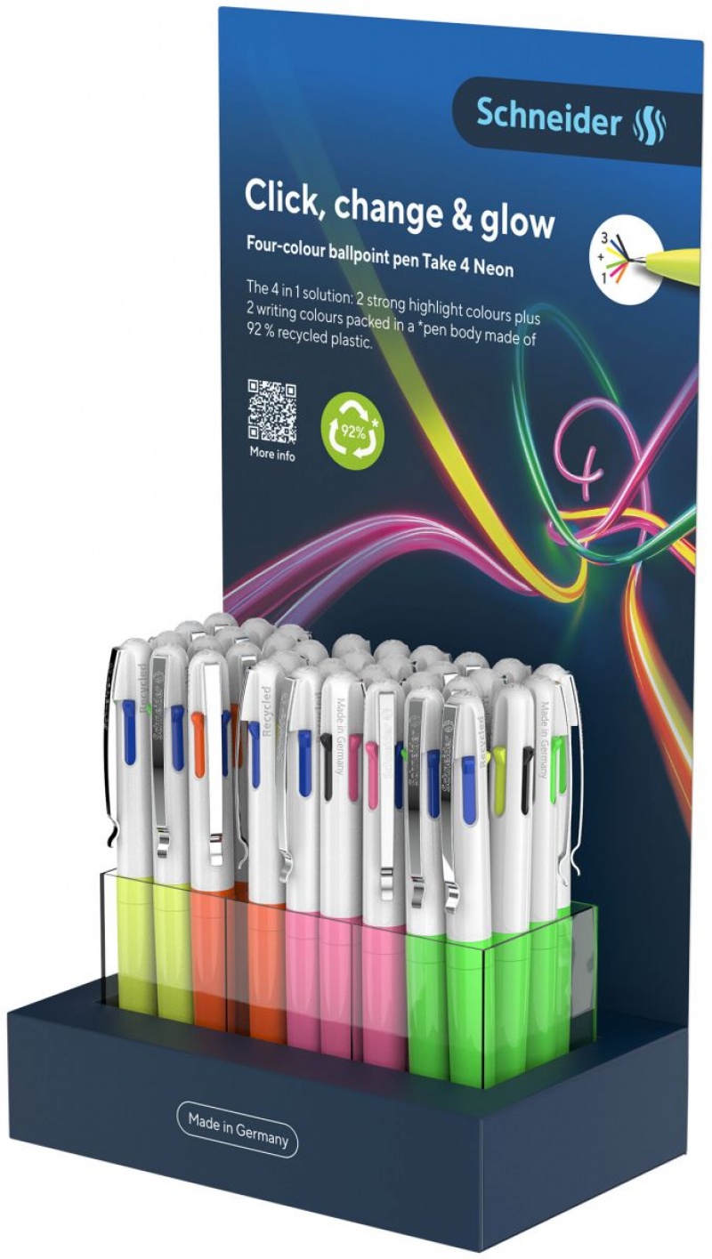 Display długopisów automatycznych SCHNEIDER TAKE 4 Neon, M, 4 kolory wkładu, 36 szt., mix kolorów