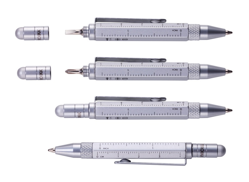 wielofunkcyjny: linijka w centymetrach i calach, śrubokręt płaski i krzyżakowy, rysik do ekranów dotykowych, wkład w kolorze czarnym + 2 zapasowe wkłady