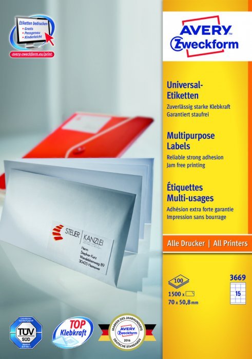 -etykiety samoprzylepne do wszechstronnych zastosowań -idealne do adresowania kopert i przesyłek pocztowych. oznaczania dokumentów. produktów i wielu innych zastosowań -przeznaczone do wszystkich typów drukarek atramentowych. laserowych oraz kserokopiarek -posiadają technologię QCT zapobiegającą wydostawaniu się kleju podczas drukowania. co chroni delikatne elementy drukarki przed uszkodzeniem-wybrane rozmiary posiadają unikalny system QuickPEEL™ ułatwiający odrywanie i szybsze przyklejanie etykiet-ekologiczne etykiety podlegające pełnej utylizacji jako odpad papierowy -etykiety z certyfikatem FSC -wytworzone z papieru pochodzącego z ekologicznie zarządzanych obszarów leśnych -etykiety Avery Zweckform można zaprojektować za pomocą DesignPro®5 -DARMOWEGO oprogramowania dostępnego na stronie www.avery-zweckform.pl