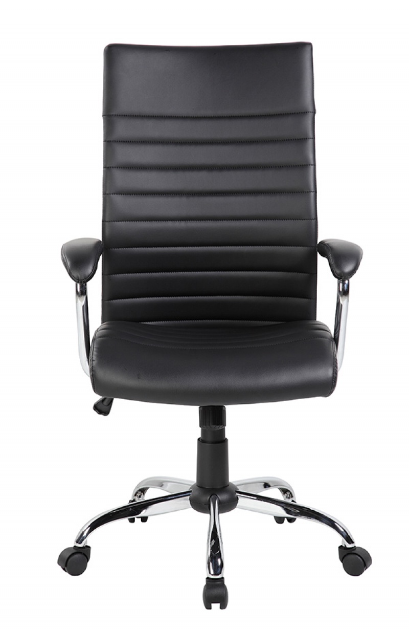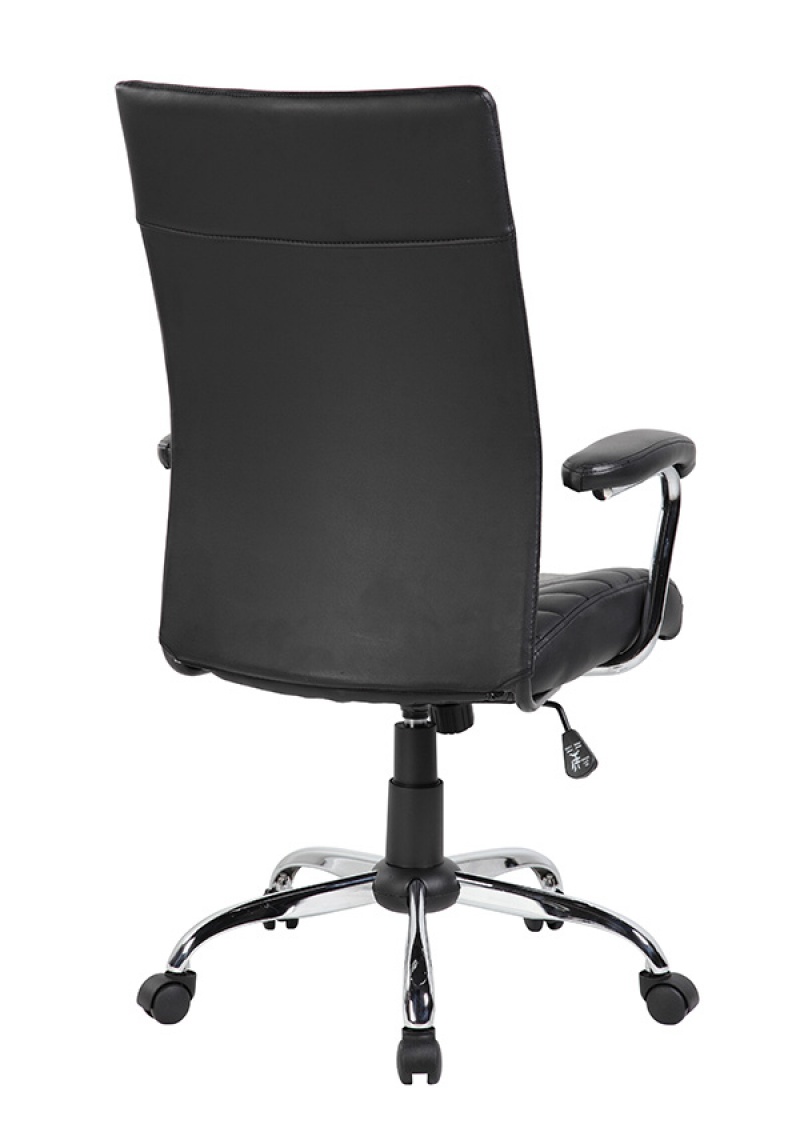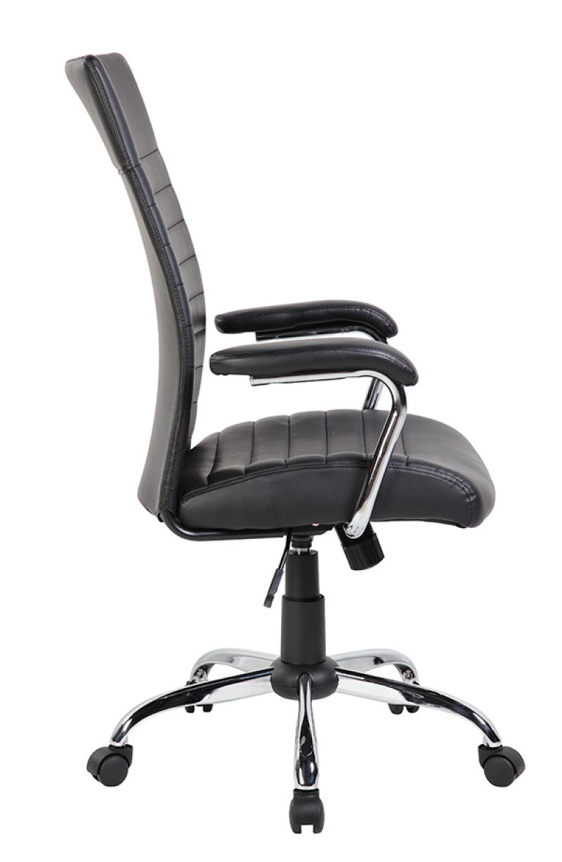 wygodny fotel biurowy z pokryty ekoskórą, tapicerowany w klasyczne, poziome pasy