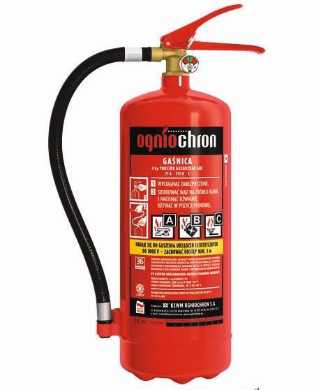 Gaśnica proszkowa 4 kg. gaśnica przeznaczona do gaszenia pożarów grupy ABC zbiornik stalowy głęboko tłoczony pokryty trwałą powłoką lakierniczą wskaźnik ciśnienia umożliwiający stałą kontrolę ciśnienia gaśnicy wąż tworzywowy ułatwiający odpowiednie kierowanie strugą proszku gaśniczego dozowanie emisji środka gaśniczego poprzez zastosowanie zaworu szybko otwieralnego umożliwiającego czasowe przerwanie wypływu środka gaśniczego zbiornik nie podlega okresowym badaniom UDT możliwość wielokrotnego napełniania w Autoryzowanych Zakładach Serwisowych czas działania 12 s wysoka skuteczność gaszenia: 13A 113B C zakres temperatur stosowania -30°C +60°C znajduje szczególne zastosowanie w obiektach użyteczności publicznej. transporcie samochodowym i kolejowym. oraz w zakładach przemysłowych. magazynach. garażach może być stosowana w górnictwie (opinia CSRG nr 43/2008) w komplecie uchwyt. dzięki któremu można zamocować gaśnicę na ścianie produkowana jest zgodnie z wymaganiami europejskiej normy PN-EN3 w oparciu o certyfikowany system jakości ISO 9001