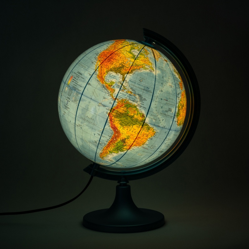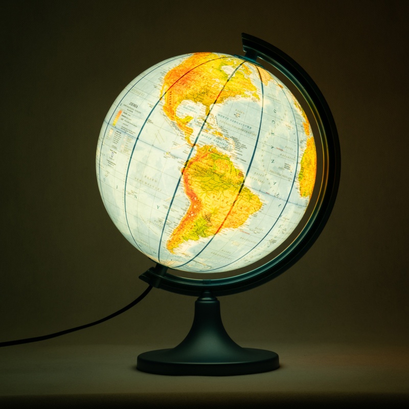 globus z mapą polityczną Świata w polskiej wersji językowej, po podświetleniu pojawia się mapa fizyczna