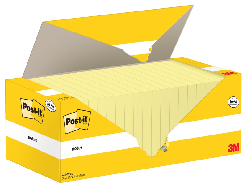 Karteczki samoprzylepne POST-IT® (654CY-VP20), 76x76mm, 100 kart./bloczek, 16 + 4 bloczki GRATIS, kanarkowo żółte