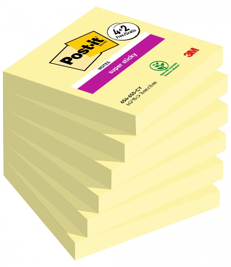 Karteczki samoprzylepne POST-IT® Super Sticky (654-P6SSCY-EU), 76x76mm, 90 kart./bloczek, 4 + 2 bloczki GRATIS, kanarkowo żółte
