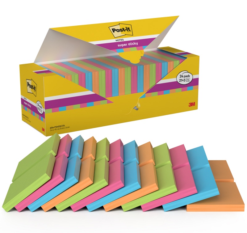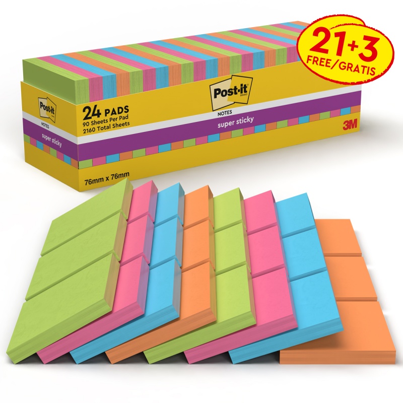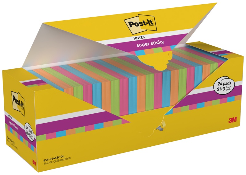 Karteczki samoprzylepne POST-IT® Super Sticky (654-SS-VP24COL), 76x76mm, 90 kart./bloczek, 21 + 3 bloczki GRATIS, mix kolorów