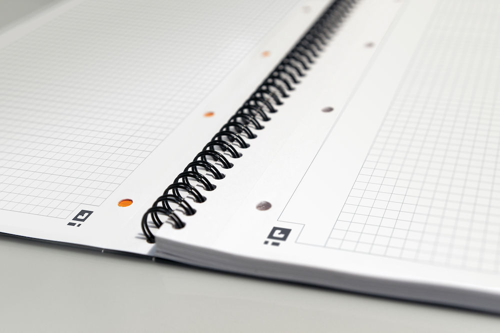 Czarna podwójna spirala zapewnia. że notatnik leży perfekcyjnie płasko po otwarciu. Twarda kartonowa okładka chroni notatnik przed zniszczeniem.