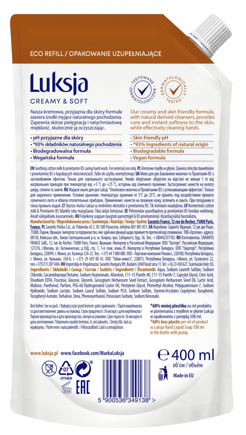 Kremowe mydło w płynie LUKSJA, bawełna, zapas 400ml