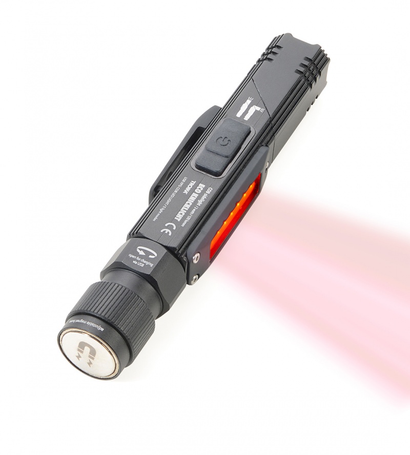 diody LED COB z boku zapewniają 120 lumenów, zarówno w postaci białego światła do pracy, jak i czerwonego światła ostrzegawczego – z funkcją szybkiego migania