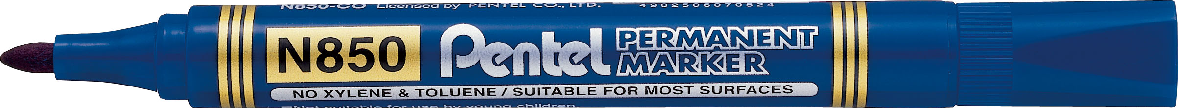 Marker permanentny Pentel _- Ekonomiczny marker permanentny. idealny do pisania po: metalu. szkle. plastiku. gumie. grubym papierze. drewnie. Grubość linii pisania 1.5mm (N850) i 4.5mm x 1.2mm (N860). ISO 9001.