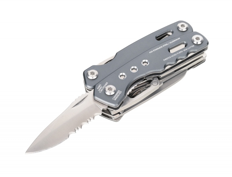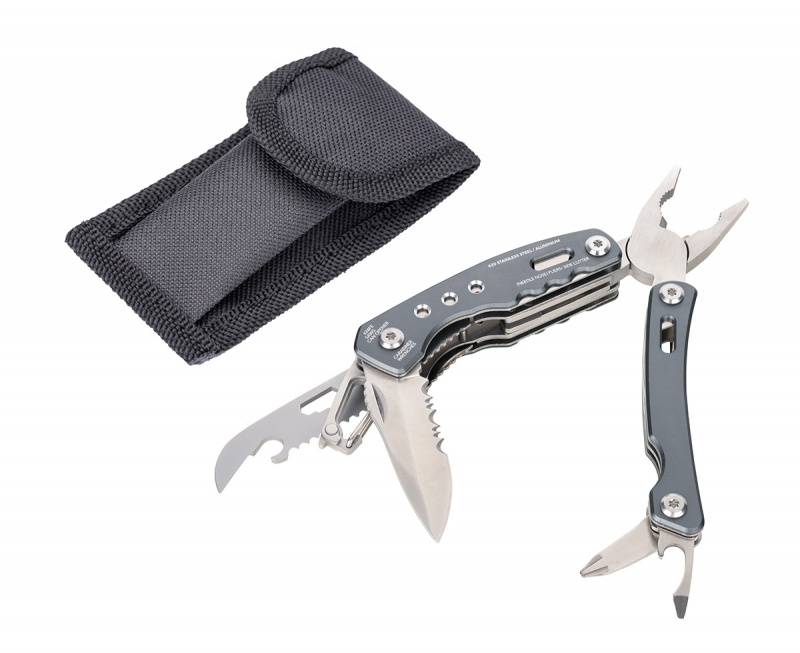 15 funkcji: szczypce wydłużone, szczypce klasyczne, obcinacz boczny, nóż, piła, śrubokręt płaski, otwieracz do puszek, pilnik, karabińczyk, otwieracz do butelek, klucz sześciokątny
