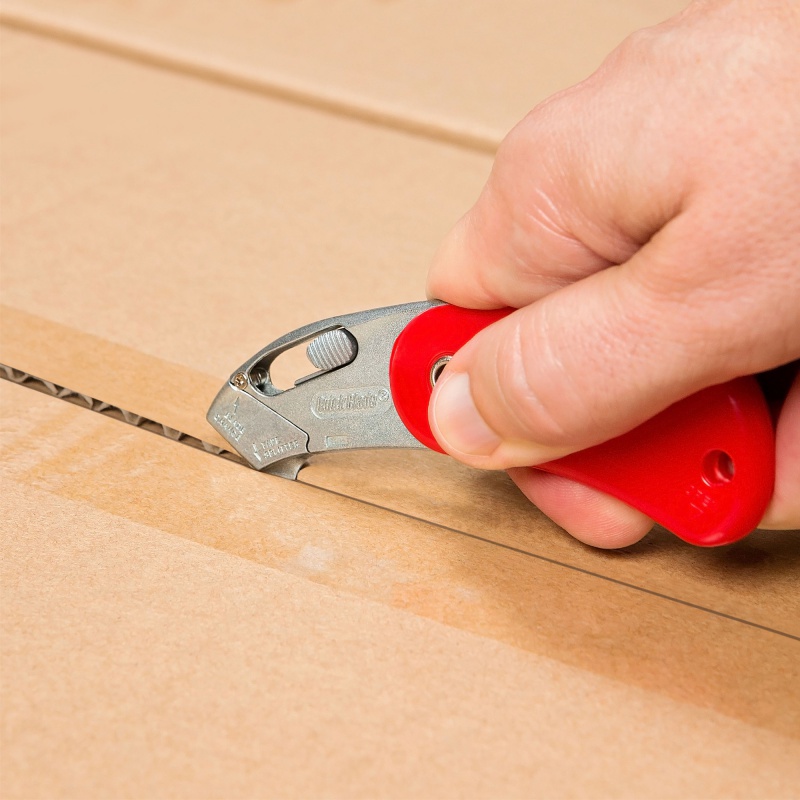 Wyposażony w niewielkie samochowające się ostrze i kolec do prucia taśmy pakowej.