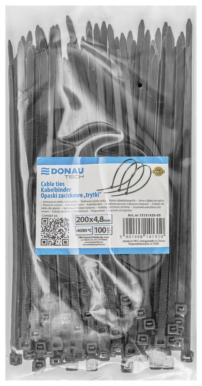 Opaski zaciskowe/trytytki DONAU TECH, 200×4,8mm, 100szt., temp. -40/80, czarne