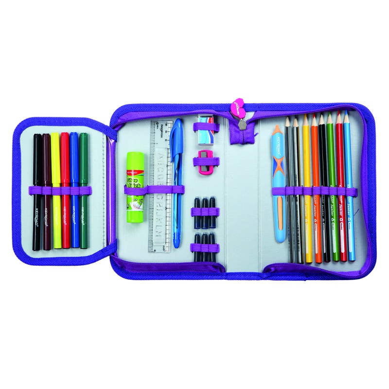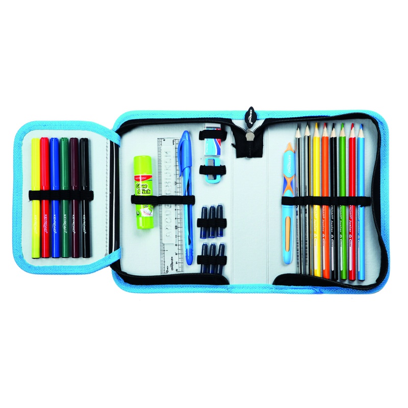 w zestawie: 6 szt. flamastrów, klej, temperówka, gumka do ścierania, długopis w kolorze niebieskim, 6 szt. niebieskich wkładów atramentowych, 2 szt. ołówków HB, pióro wieczne, 6 szt. kredek ołówkowych, linijka 15 cm, 2 szt. szablonów plastikowych z literami (A-M, N-Z)