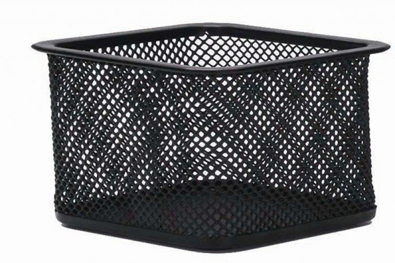 kwadratowy pojemnik na spinacze wykonany z metalowej siateczki powlekanej lakierem