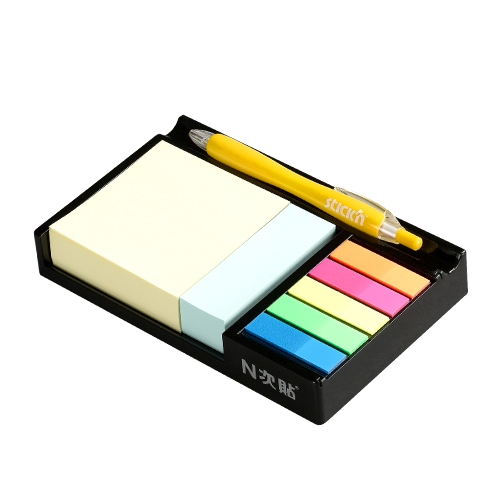 Mniejszy przybornik zawiera: notes 76x76mm. 400 karteczek – mix 3 kolorów oraz 380 zakładek indeksujących papierowych o wymiarach 76x14mm – mix 4 kolorów. Większy przybornik zawiera: notes żółty pastelowy 76x76mm – 200 karteczek. 200 zakładek niebieskich pastelowych 76x25mm oraz 125 foliowych zakładek indeksujących 45x12mm – mix 5 kolorów neonowych. Dodatkowo obydwa przyborniki posiadają specjalne miejsce na umieszczenie długopisu.”