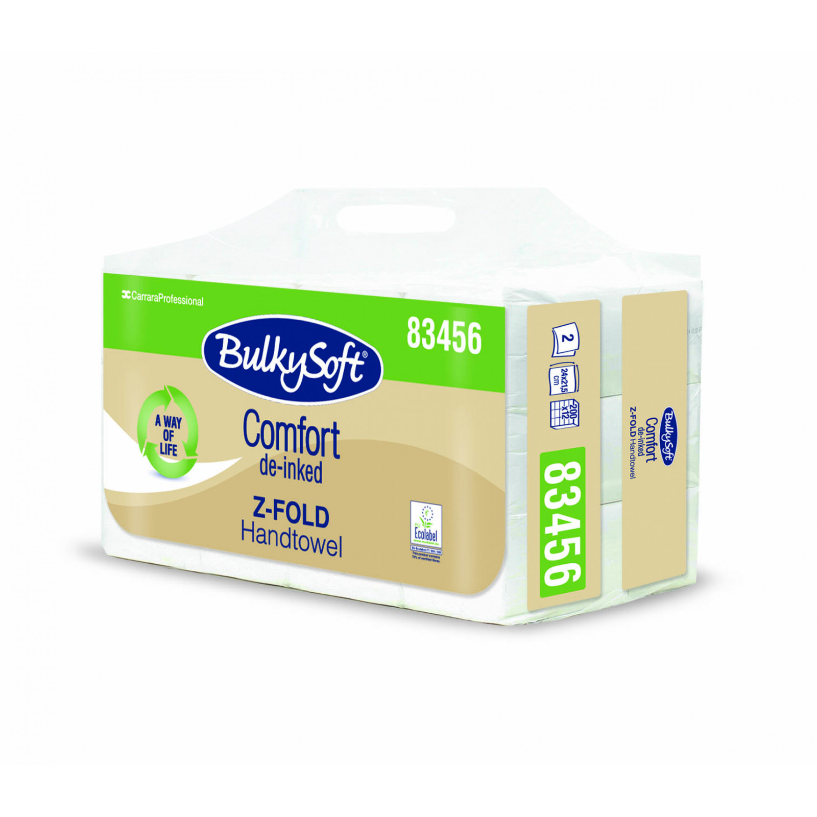 Ręcznik papierowy BulkySoft COMFORT EKOLOGICZNY składany typu Z 3 panel 24×21.5 cm. 2w. biały. celuloza + celuloza z recyklingu. 2400 szt./op.