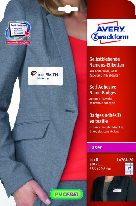 Samoprzylepne identyfikatory L4784-20 63,5×29,6 20 ark., białe, sztuczny jedwab, Avery Zweckform