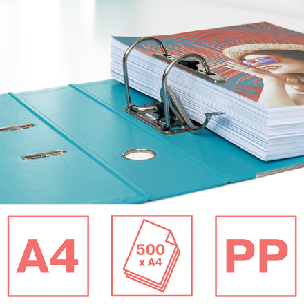 Grzbiet o szerokości 75 mm pozwala zmieścić do 500 kartek (80 g/m²) a kieszonka na etykietę zapewnia czytelny opis zawartości