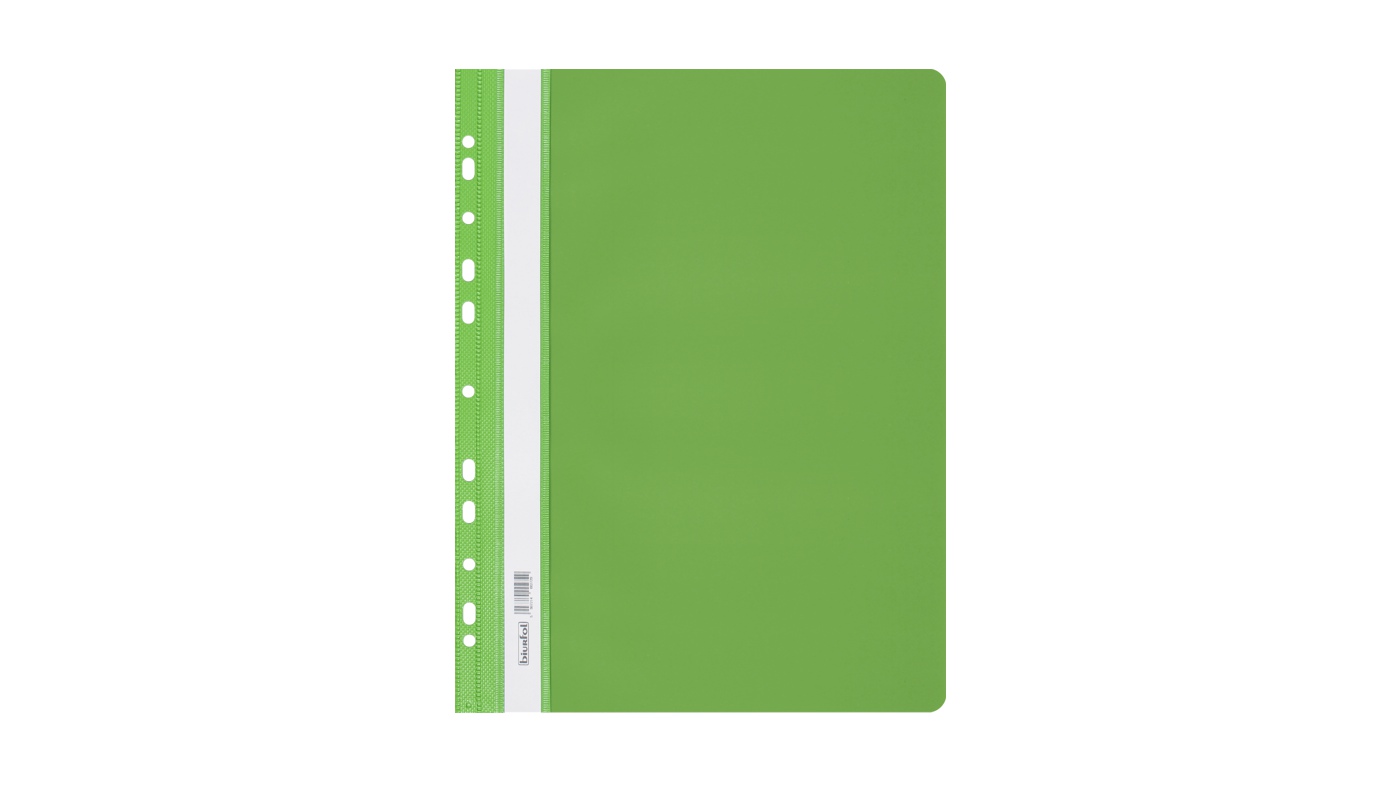 – folia PVC. przód twardy przezroczysty. tył twardy kolorowy_- boczna perforacja umożliwia wpięcie do segregatora z dowolnym ringiem_- w środku blaszka i wąs o długości 16.5 cm. umożliwiający wpięcie dokumentów do 2 cm_- wymienny papierowy pasek do opisu z kodem kreskowym na szt._- dwa wycięcia ułatwiające wysuwanie paska_- zaokrąglone rogi obu okładek