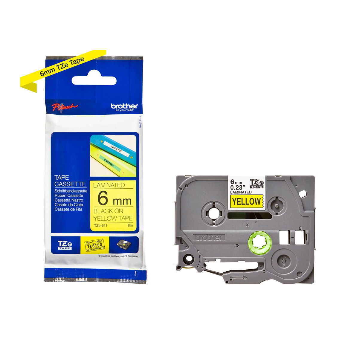 Taśma laminowana Brother TZe-611 (poprzednio TZ-611 TZ611) o szerokości 6mm i długości 8m. Druk: czarny, tło: żółte.