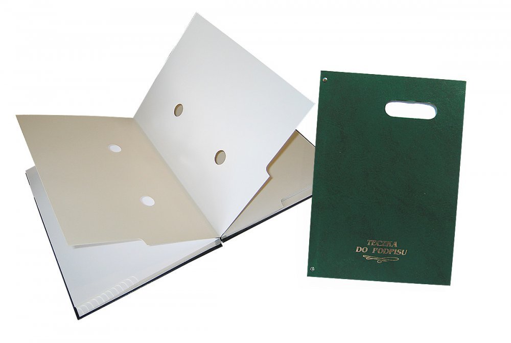 Teczka do podpisu z okienkiem Warta_- okładka twarda oklejana. Grzbiet harmonijka. Łączenie okładki z blokiem wzmocnione nitami. Na przedniej okładce okienko z szybką. pod którą można umieszczać napisy. _- blok z kartonu barwionego w masie zawiera 20 kart z 2 otworami i wyciętymi registrami_- jednostka sprzedaży 1 sztuka
