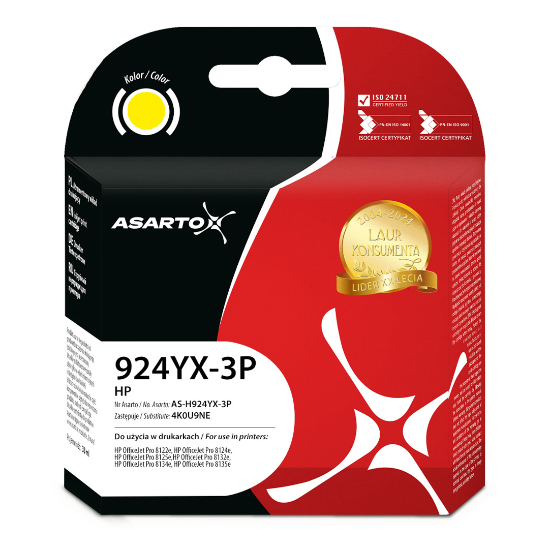 Tusz Asarto do HP 924e 3-PACK | 4K0U9NE | 924YX-3P | 3*800 str. | yellow
