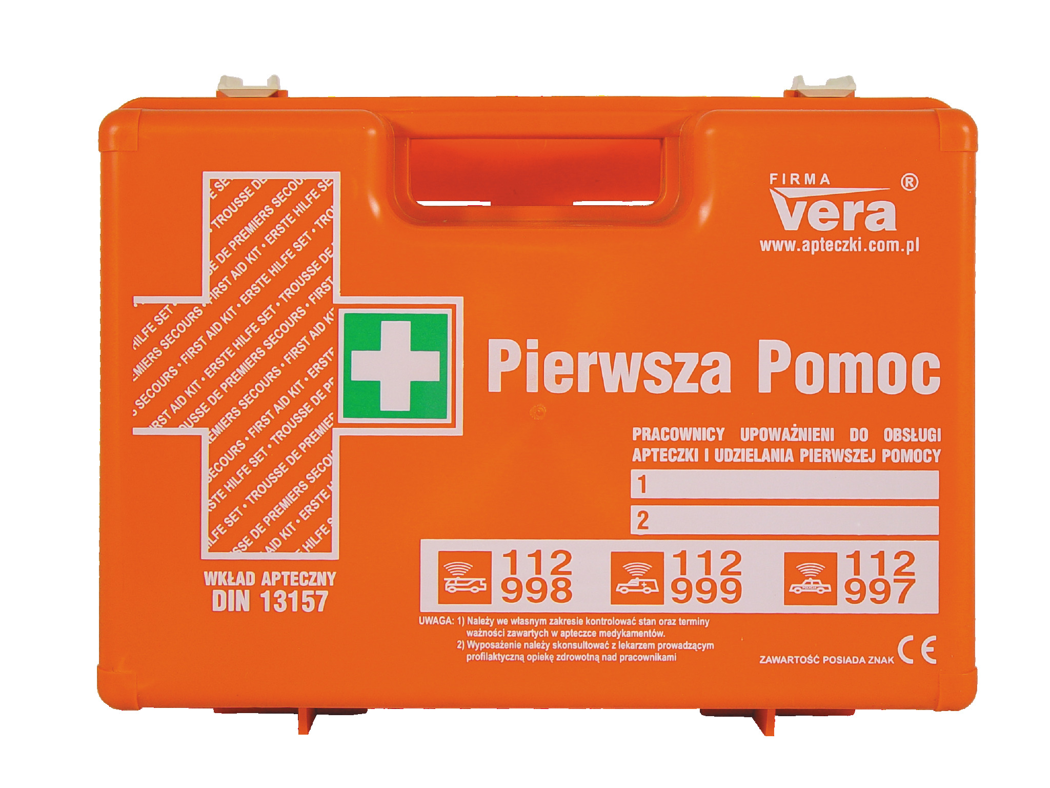 – Vera apteczka DIN 13157 top 15 + – wymiary apteczki: 330x235x125 mm – kolor pomarańczowy – stelaż mocujący do ściany- skład apteczki: kompres zimny. 2 kompresy na oko.3 kompresy 10×10 cm. 2 opaski elastyczne 4mx6cm. 2 opaski elastyczne 4mx8 cm. 8 sztuk plastrów 10×6 cm. zestaw plastrów 20 sztuk. przylepiec 5mx2.5 cm. opatrunek indywidualny G. 3 szt. opatrunek indywidualny M. opatrunek indywidualny K. chusta opatrunkowa 60×80 cm. 2 szt. chusty trójkątne. chusta z fiseliny (5 szt.). koc ratunkowy 160×210 cm. nożyczki 19 cm. rękawice winylowe 4 szt.. 2 worki foliowe 30×40 cm. chusteczki dezynfekujące 6 szt. ustnik do sztucznego oddychania. instrukcja udzielania pierwszej pomocy wraz z wykazem telefonów alarmowych.