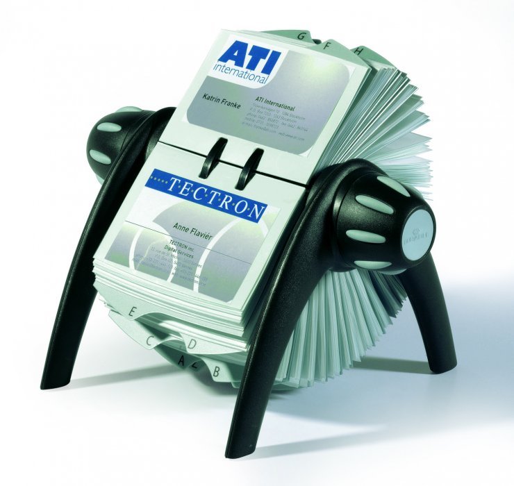 Wizytownik obrot. na 400 wizytówek Durable_VISIFIX flip – wizytownik obrotowy. Może pomieścić nawet do 400 wizytówek. Przekładki od A do Z pozwalają na ich szybkie wyszukiwanie. Kolory: srebrny lub czarny_- jednostka sprzedaży 1 sztuka