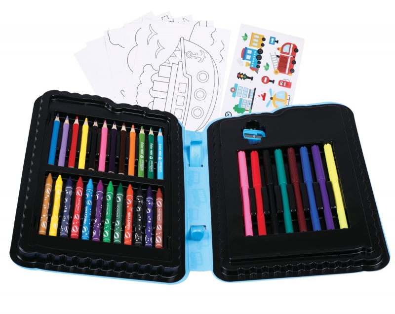 zawartość: 12 kredek ołówkowych, 8 flamastrów, 12 kredek świecowych, 5 kolorowanek, 16 naklejek oraz temperówka